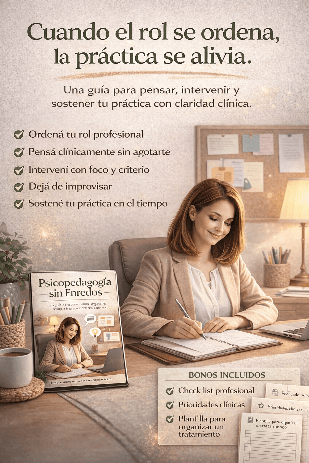 Psicopedagogía sin Enredos es una guía clínica pensada para psicopedagogas que ya trabajan y necesitan ordenar su práctica, no sumar más teoría.